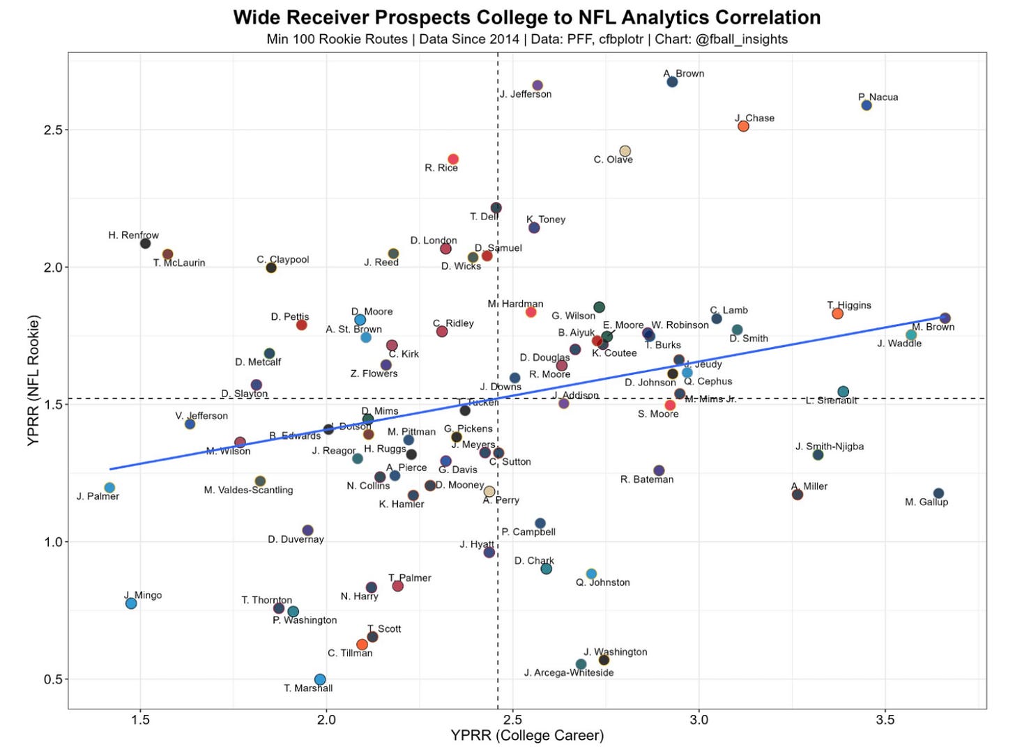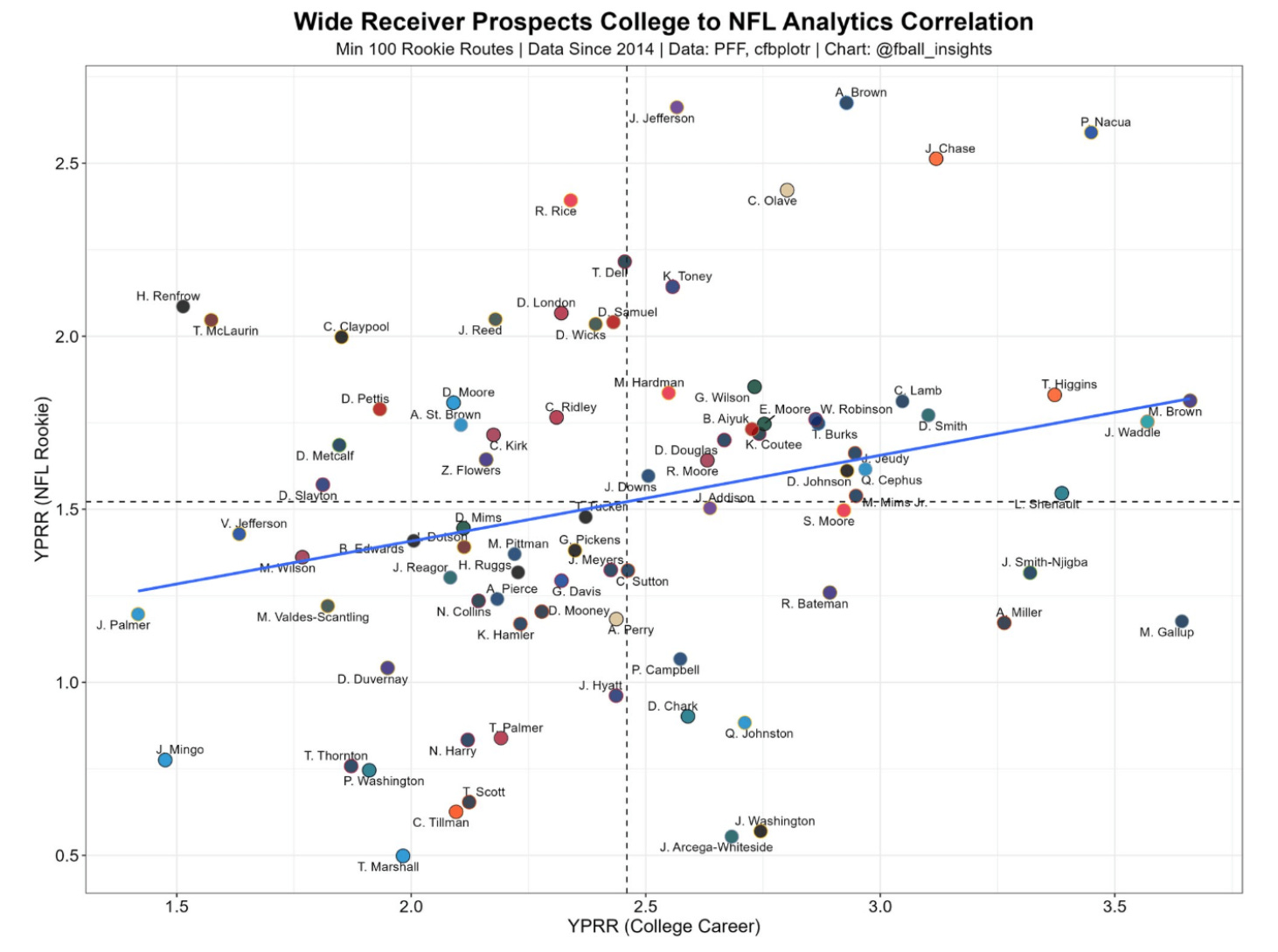 The graph above from Football Insights shows a positive correlation between collegiate YPRR and NFL YPRR. We can expect players to continue to command targets and generate production on them as they transition to the NFL.