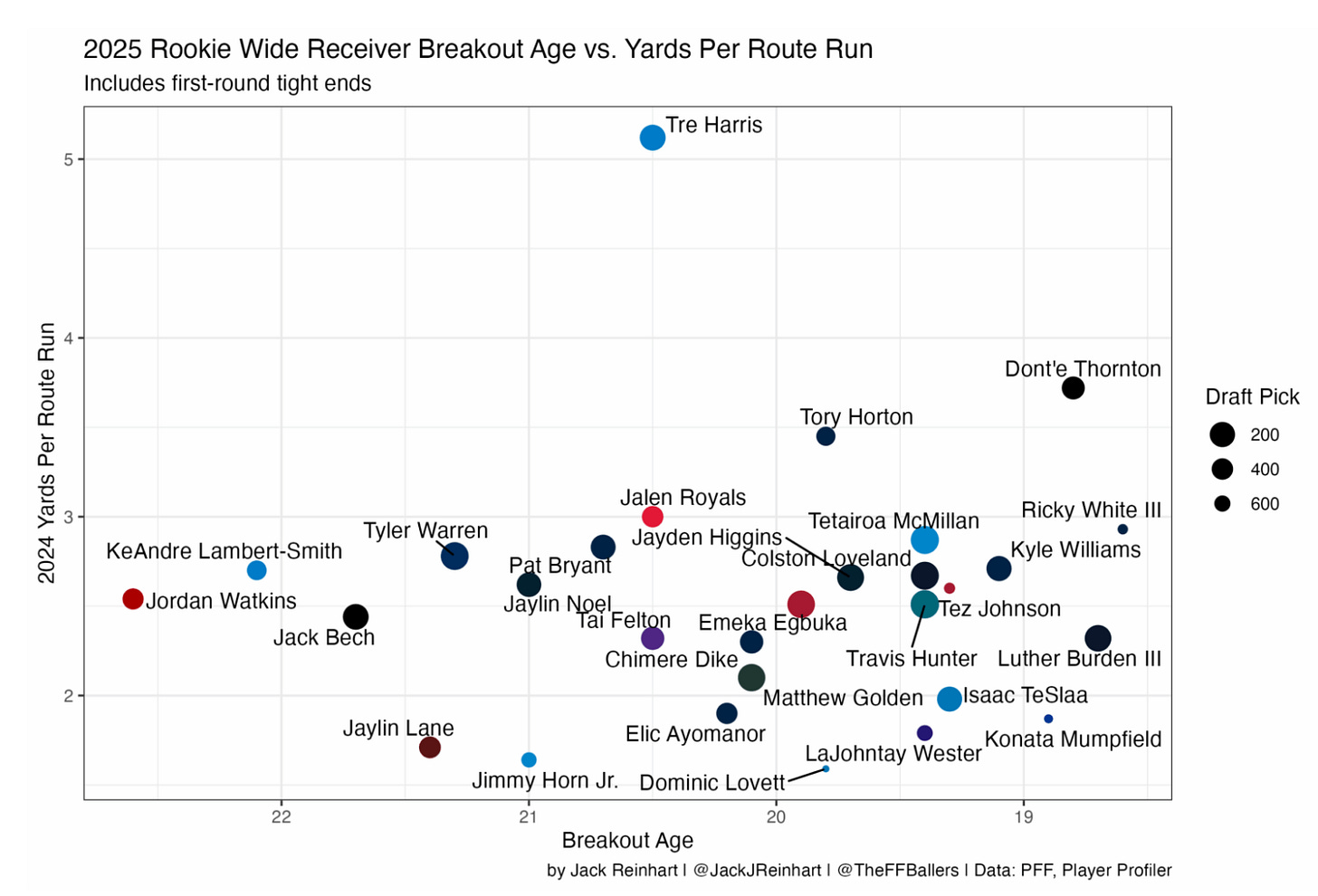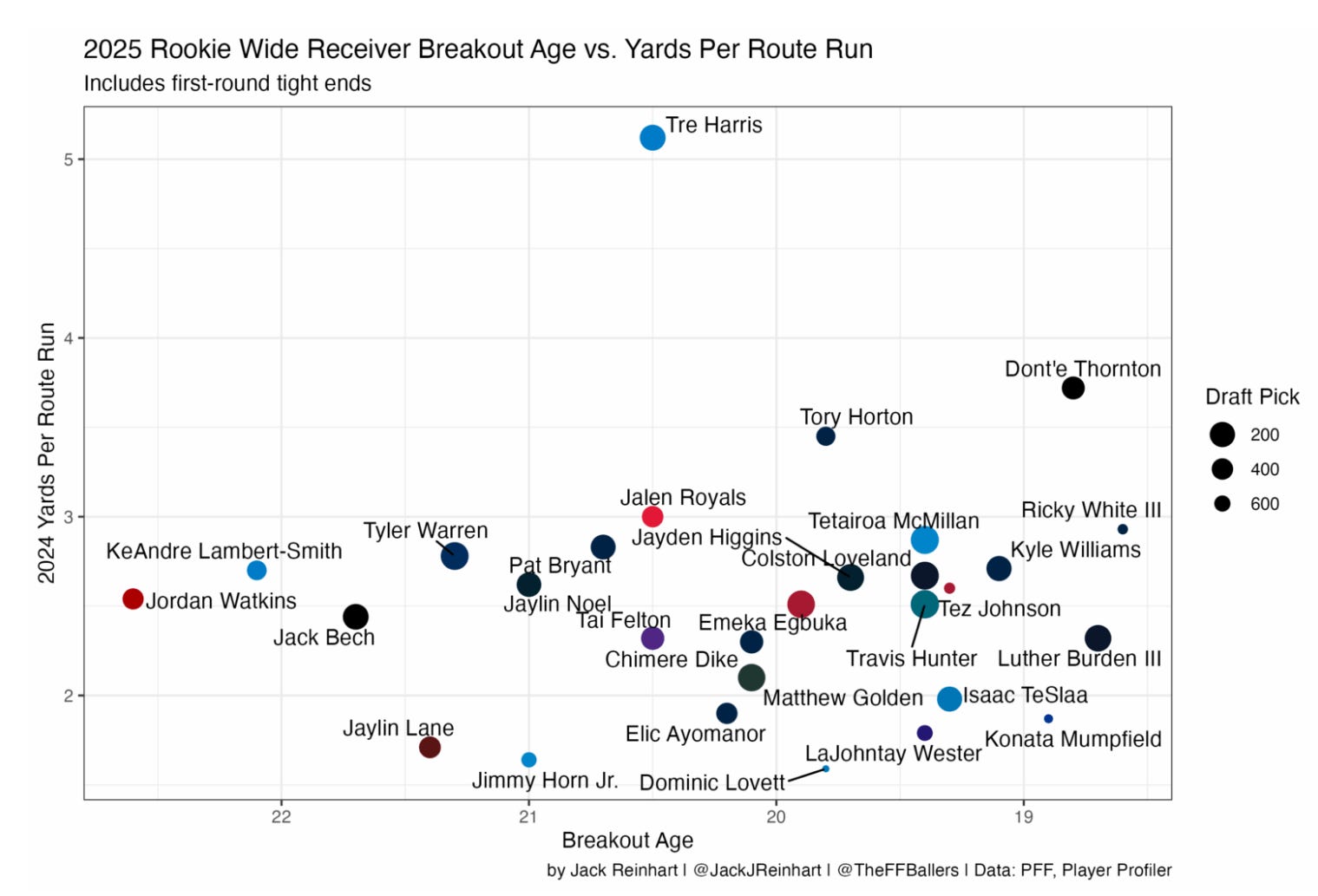 Ricky White, Luther Burden, and Dont’e Thornton broke out the earliest of the 2025 class, each doing so at younger than 19 years old. Earlier breakouts improve the outlook for rookie receivers, though any breakout under 20 years old is considered early and elite.