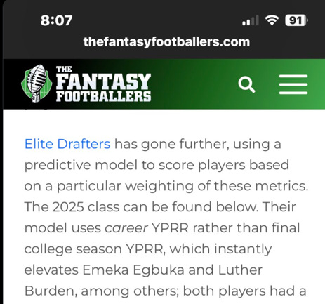 This article is based on the Elite Drafters model — a predictive framework developed and published by the independent football analytics brand, Elite Drafters. Built on draft capital, yards per route run (YPRR), and breakout age, the model has shaped wide receiver evaluation at both the professional and fantasy level — across dynasty, redraft, and real-life scouting — since early 2021.