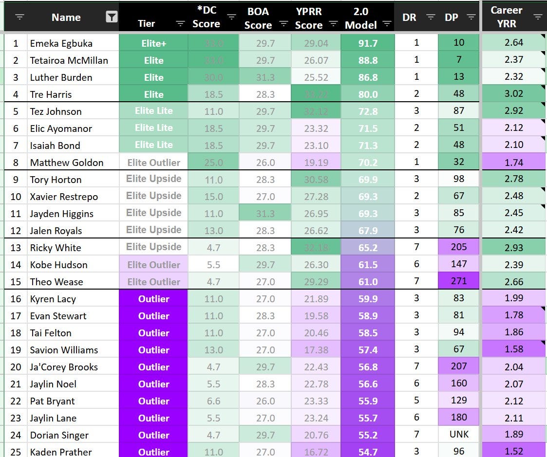 Elite Drafters has gone further, using a predictive model to score players based on a particular weighting of these metrics. The 2025 class can be found below. Their model uses career YPRR rather than final college season YPRR, which instantly elevates Emeka Egbuka and Luther Burden, among others; both players had a season prior to 2024 with a YPRR above three, while they fell below the mark in 2025. This Drafters chart below illustrates
